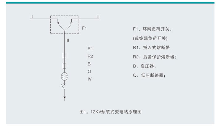 10kV預裝式變電站的外形及結構見圖2、圖3郵箱分上下(或左右)兩部分,上面為高壓油箱,下面為變壓器油箱,兩者僅電氣連接而又不通。原理圖見圖1,圖中“I”“II”線路為環網饋電線,“III”支路為變壓器支路,“IV”為低壓輸出。變電站既可用于環網供電系統,也可用于終端系統中,裝換十分方便。“I”“II”線路及“III”支路饋電同環網負荷開關進行切換,同時,變壓器高壓側進線端裝有后備保護熔斷器和插入式熔斷器,用于保護該支路的短路故障以及過載過溫保護。同時還可以安裝高壓顯示裝置及安裝避雷器。變壓器的低壓端通過計量表計和低壓斷路器后輸出。