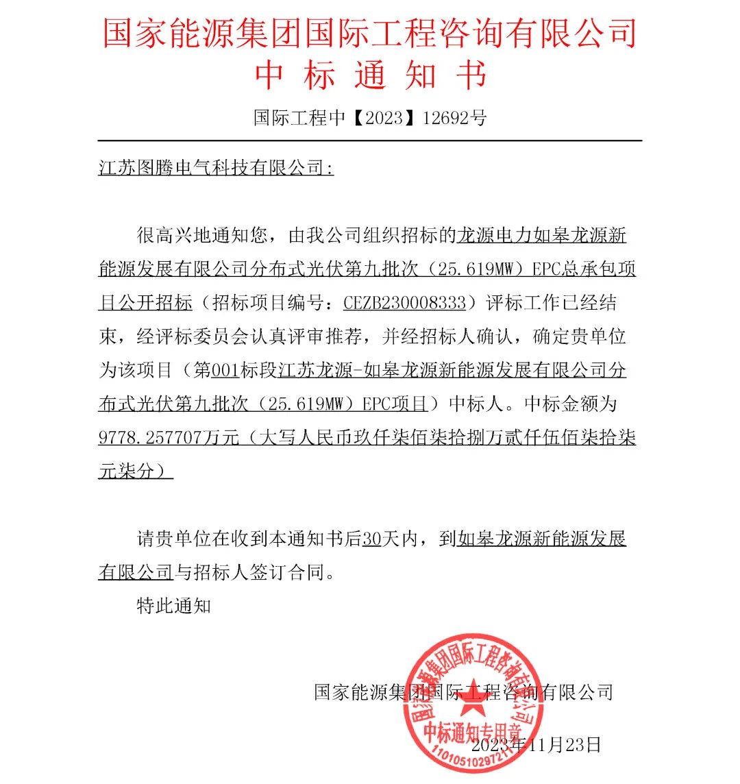 歲末沖刺,一路“標”升!近日,圖騰電氣成功中標如皋龍源新能源發(fā)展有限公司分布式光伏第九批(25.619MW)EPC總承包項目,中標金額為9778.257707萬元。...