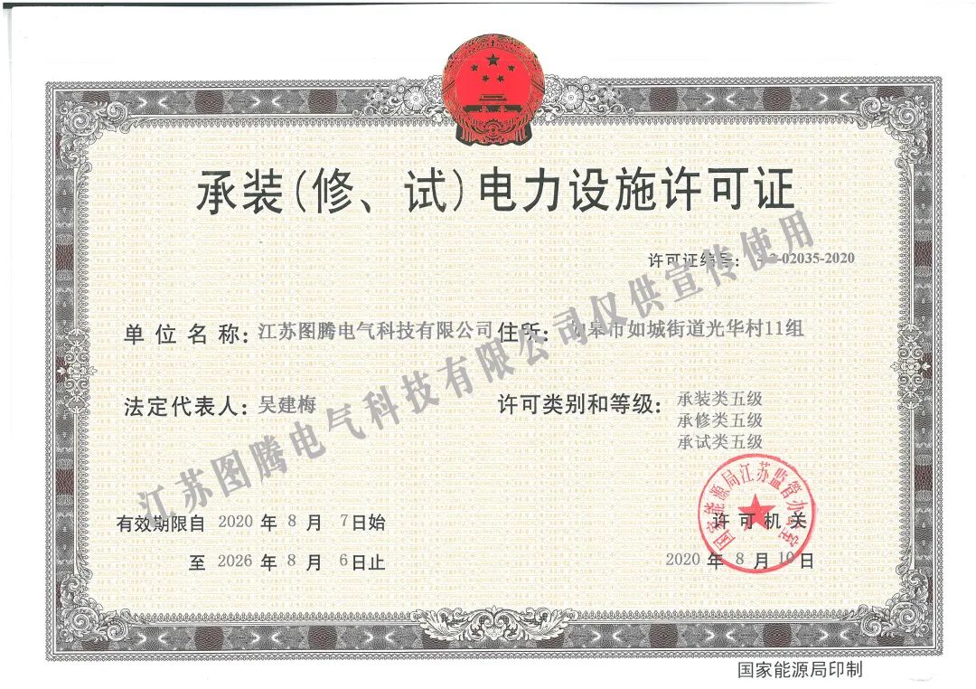 近日,江蘇圖騰電氣科技有限公司順利通過國家能源局江蘇監管辦公室審核,取得承裝(修、試)電力設施許可證,標志著公司具備了開展10千伏以下電力設施維修、試驗的能力,為今后在電力設施中的試驗、維修領域施工...