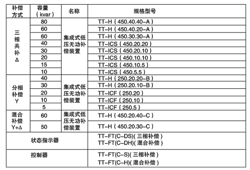 TT-H系列智能集成低壓無功補償裝置包括:分相補償產品、三相補償產品。